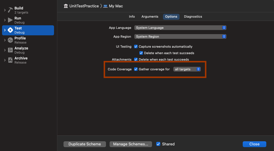 Code Coverage에 체크를 해주시고 Close를 누릅니다.