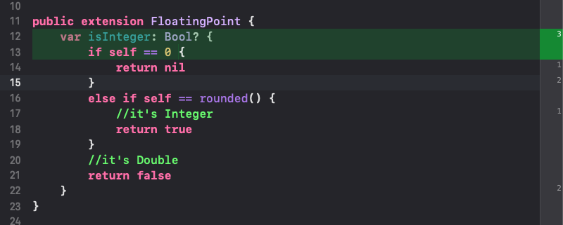 nil에 대한 테스트를 제공하기 위해 0일때 nil을 반환하게 하였고, rounded() 메소드를 활용하여 Integer이면 true를 리턴, 그렇지 않으면 false를 리턴하게 하는 코드입니다.