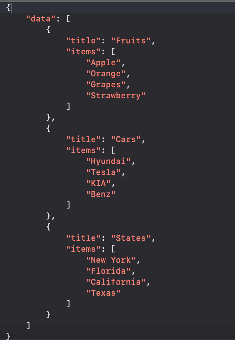 "data" 에는 배열이 있고, 각각의 배열에는 "title"과 "items"가 있습니다 표현해 보면