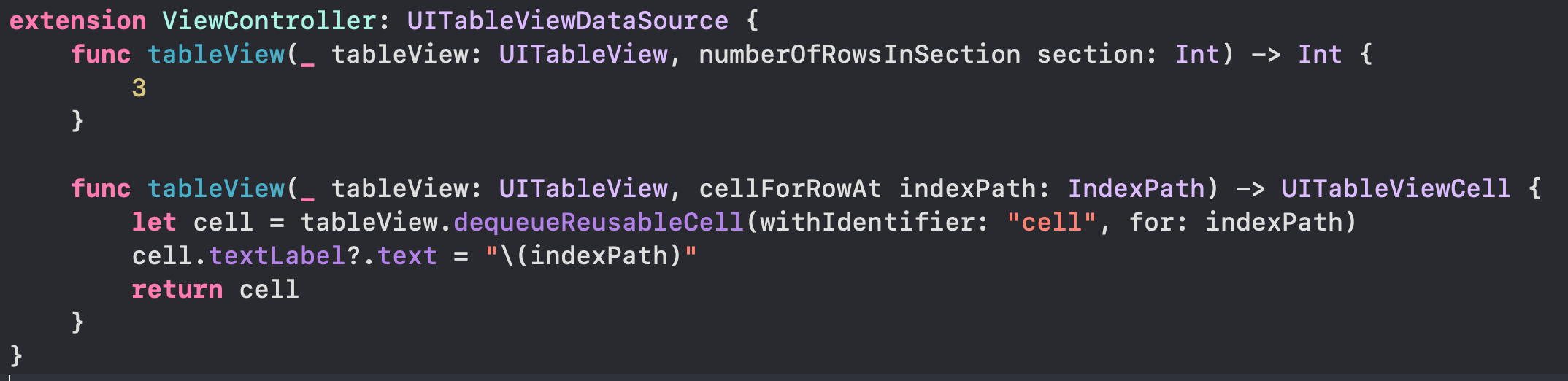 기본적으로 이렇게 2가지의 필수 구현 메소드가 존재합니다. 위의 메소드는 numberOfRowsInSection 즉 Section에 몇개의 Row가 들어갈 지 정하는 것이고,
