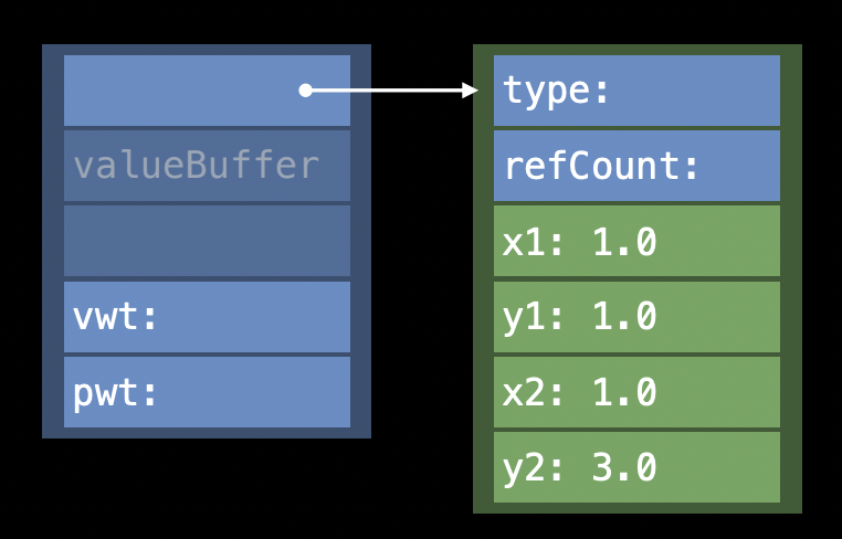 여기서 또하나 알 수 있는것은 Point 타입과 Line타입의 저장 방식이 다르다는 것입니다. 그렇다면 Existential Container역시 이러한 차이를 관리해줄 필요가 있습니다.