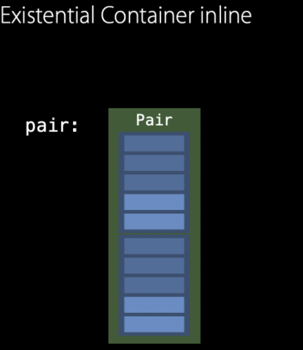 Swift는 필요한 두개의 existential container를 저장할 것 입니다. 그리고 두개의 existential container를 Pair 구조체로 감싸서 pair의 inline에 저장하게 됩니다. 프로그램은 이후에 다음 그림과 같이 초기화를 진행합니다.