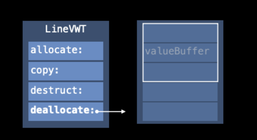 이번에도 Table기반 메커니즘인 Value Witness Table입니다. Value Witness Table은 value에 대한 lifetime을 관리하는 역할을 합니다. 또한 Type마다 이 table을 가지고 있습니다. 즉 Point의 Value Witness Table도 있고, Line의 Value Witness Table도 있다는 것입니다.