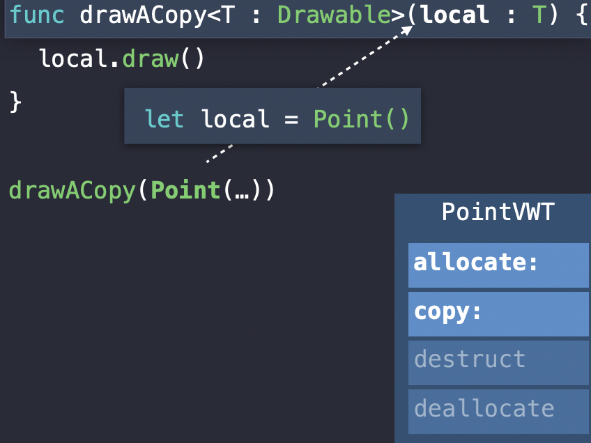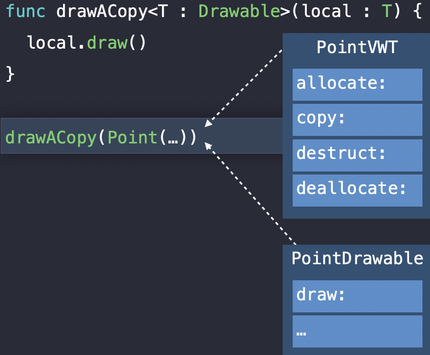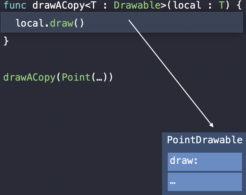 One shared implementation. 우리가 Protocol타입을 사용할 때 하나의 실행문(implementation)을 공유하게 됩니다. 그리고 이는 어떠한 타입의 메서드인지 확인해야하기 때문에 Protocol Witness Table, Values Witness Table을 사용해야 합니다. 그러나 One type per call context 덕분에 Swift는 existential container를 사용하지 않을 수 있습니다. 대신에 이 call site에서 추가적인 argument로써 Point의 VWT와 PWT를 전달합니다.