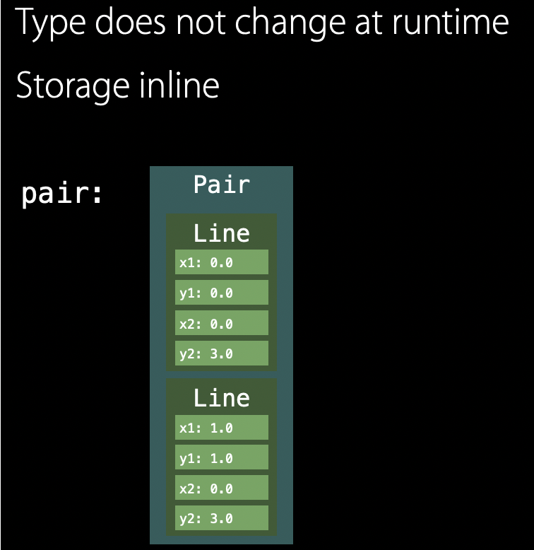 2개의 Line 인스턴스가 Pair라는 타입에 묶여있는 모습을 볼 수 있습니다. 추가적인 Heap allocation이 필요하지 않은 상황입니다. 또한 pair.first = Point() 와 같은 것도 안됩니다.