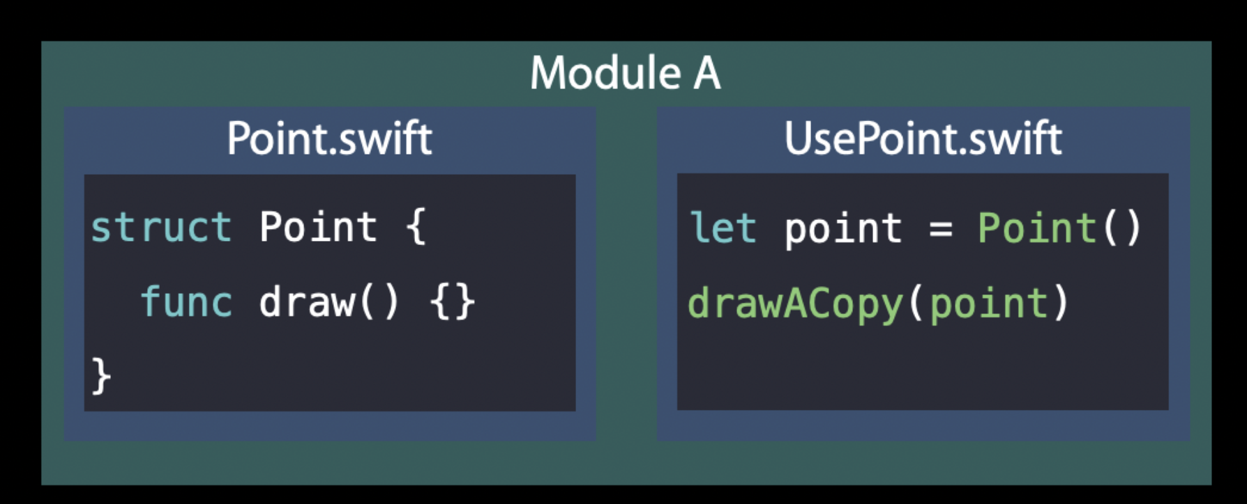 컴파일러는 두 파일을 하나의 unit으로 보고 두개의 파일을 함께 컴파일하게 됩니다. 그러면 Point에 관한 정의를 볼 수 있게 되겠죠. 이러한 멋진 발전 덕분에 XCode 8 부터의 whole module optimization을 통한 다양한 성능 향상이 가능해 졌습니다.