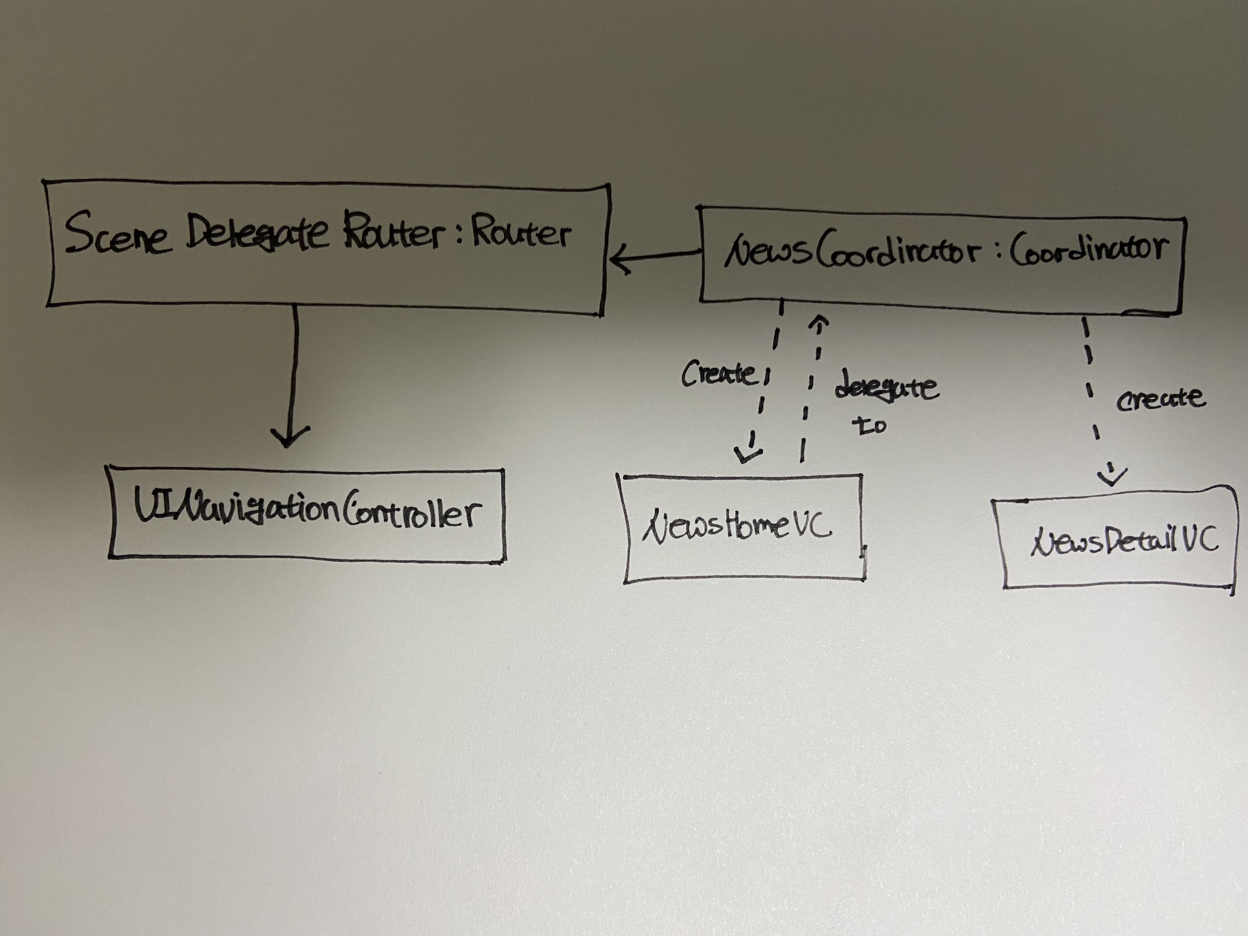 해당 부분은 News를 선택했을 때 NewsDetailViewController를 보여주는 로직입니다. 즉, Coordinator Pattern을 사용하면, 같은 흐름에 있는 View Controller들이라도 서로 모르는 사이가 된다는 것입니다.