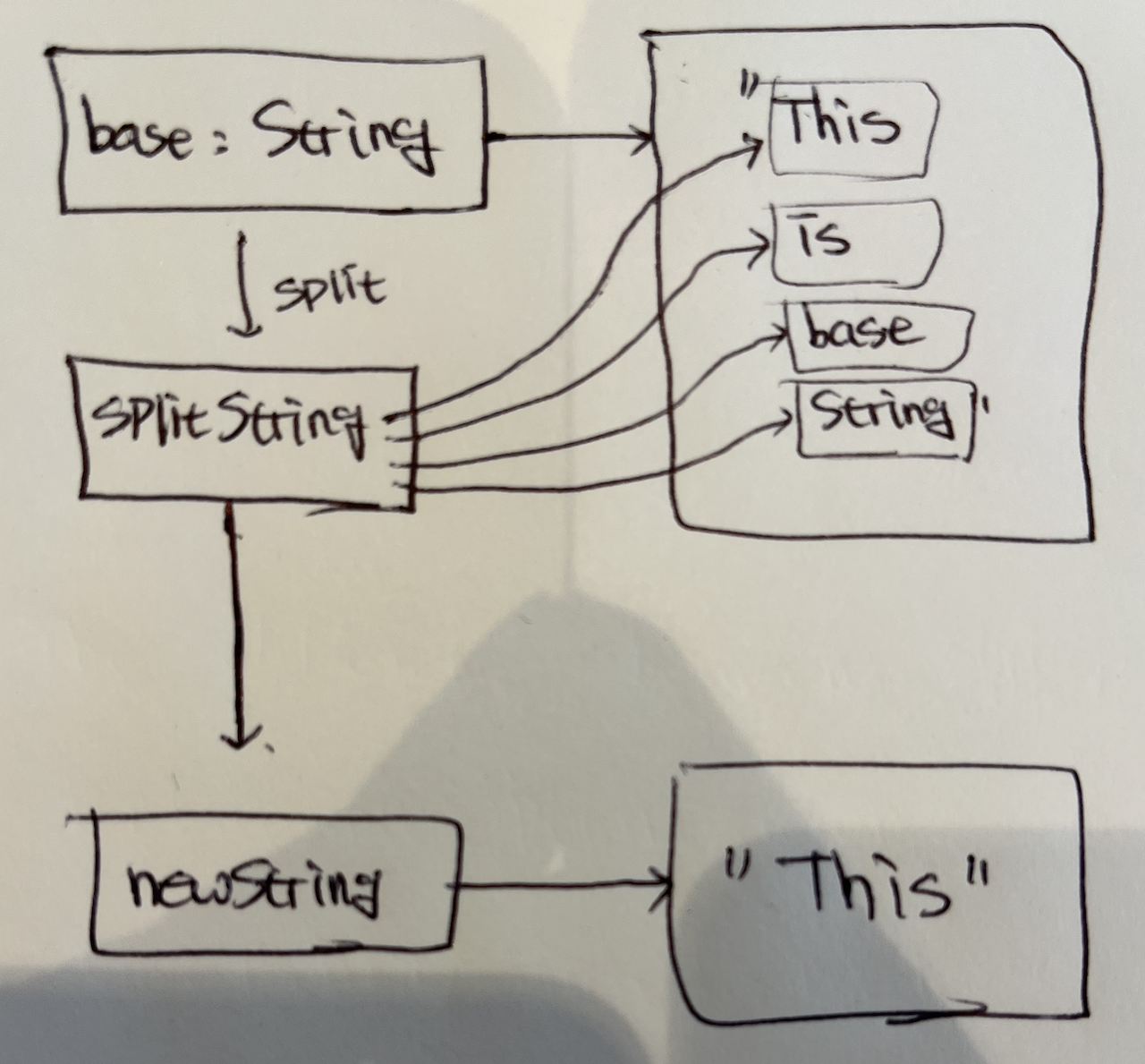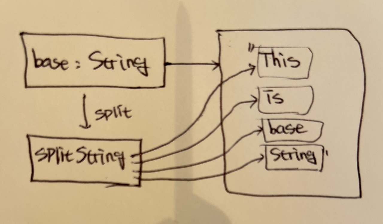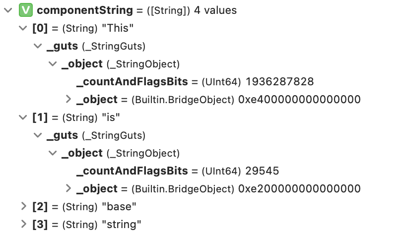 components 메서드로 String을 나눈 결과는 base라는 String과 아무런 관련이 없습니다. 새로운 메모리 공간에 "This", "is", "base", "string" 각각이 할당되고, 그것들의 배열을 만들어 낸 것을 확인할 수 있습니다.