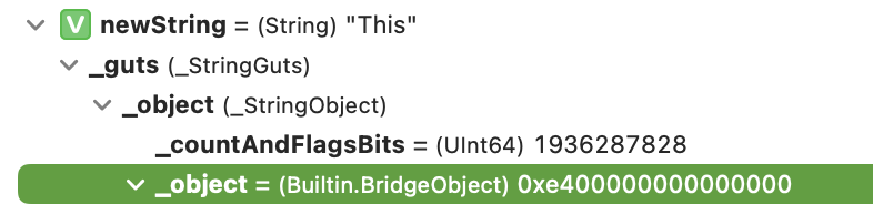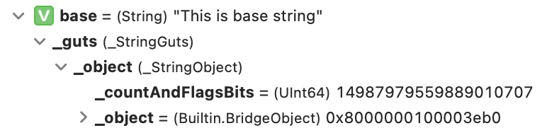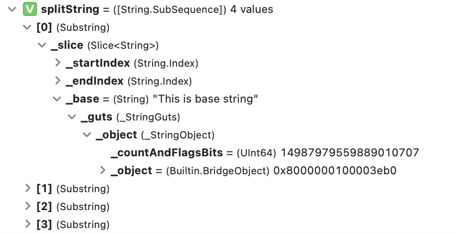 어디서 많이 본 주소값이 있습니다. 바로 저 0x8000000100003eb0 이 주소! 아까 base의 StringObject가 담긴 주소값과 동일한 것을 확인할 수 있습니다. 이를 startIndex와 endIndex를 활용하여 Slice 즉, 잘라서 표시해주는 것을 알 수 있습니다.