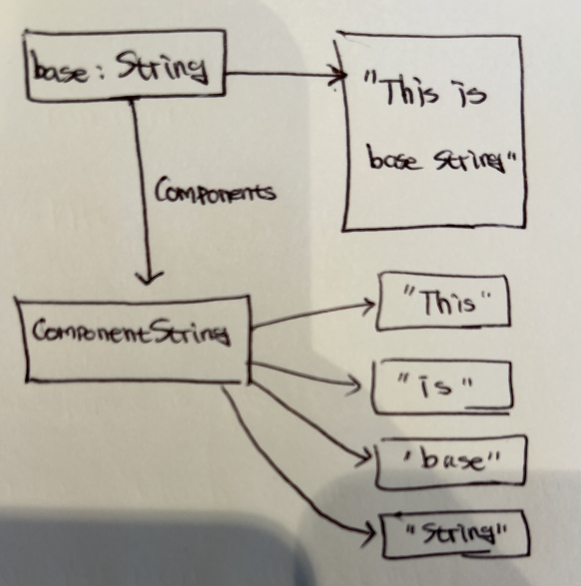 components 메서드로 String을 나눈 결과는 base라는 String과 아무런 관련이 없습니다. 새로운 메모리 공간에 "This", "is", "base", "string" 각각이 할당되고, 그것들의 배열을 만들어 낸 것을 확인할 수 있습니다.