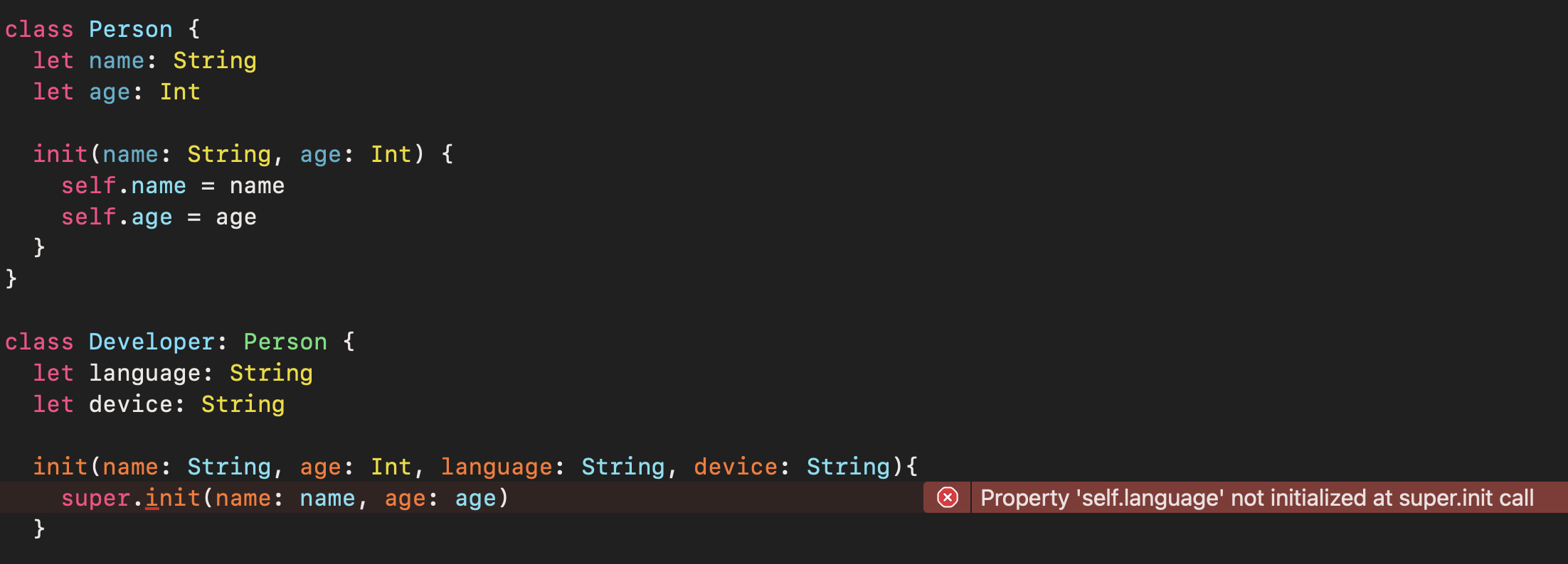 위에서 self.name 즉, 상속받은 Person 클래스의 프로퍼티인 name에 superclass의 초기화 이전에 접근하게 된다면, 컴파일러가 이를 발견하고 에러를 보여주게 됩니다.