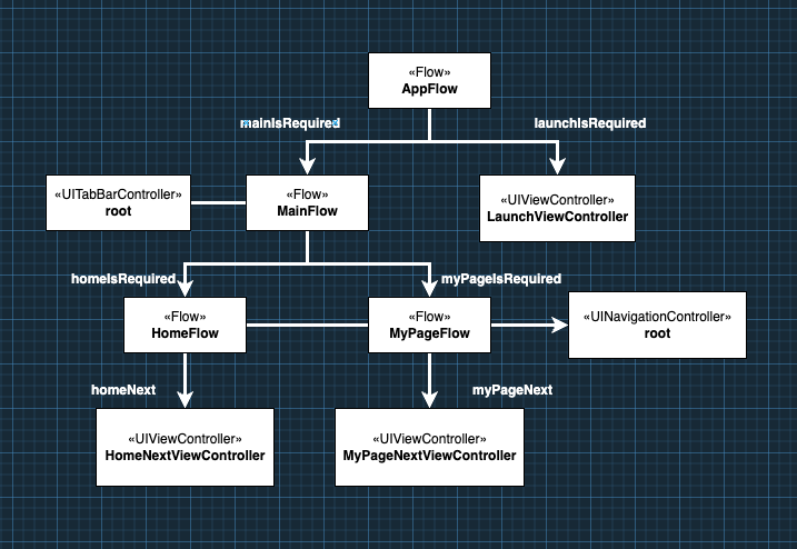 - Flow : 각 Flow는 navigation action을 정의하는 부분입니다. ex ) UIViewController를 push 하거나 present하는 코드.